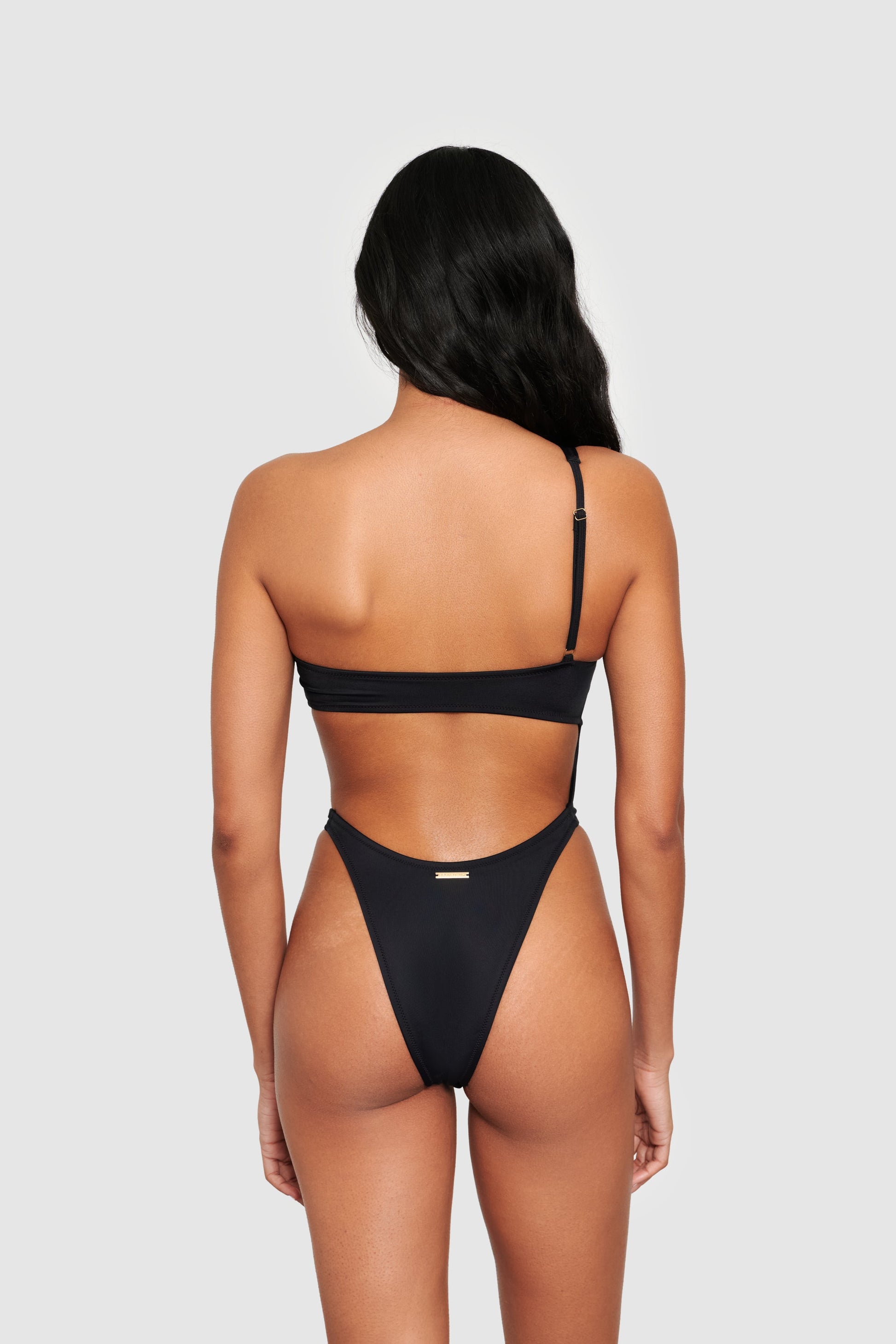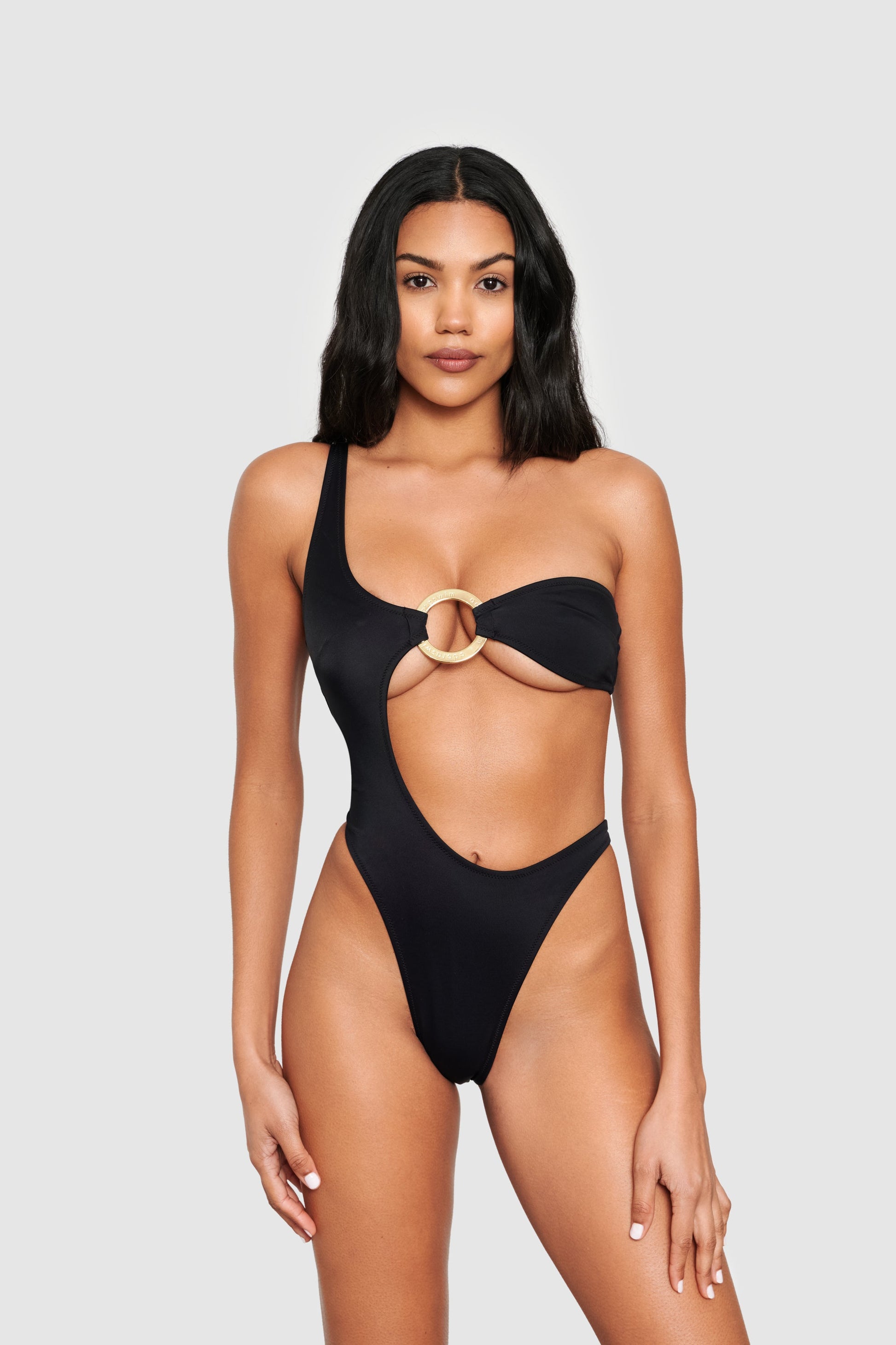 ADORA swimsuit has a high rise cut to elongate legs and enhance your natural shape. A cut-out tummy area for extra sexiness with a single strap over the shoulder. Cheeky bum style topped with a beautiful ADORA ring.