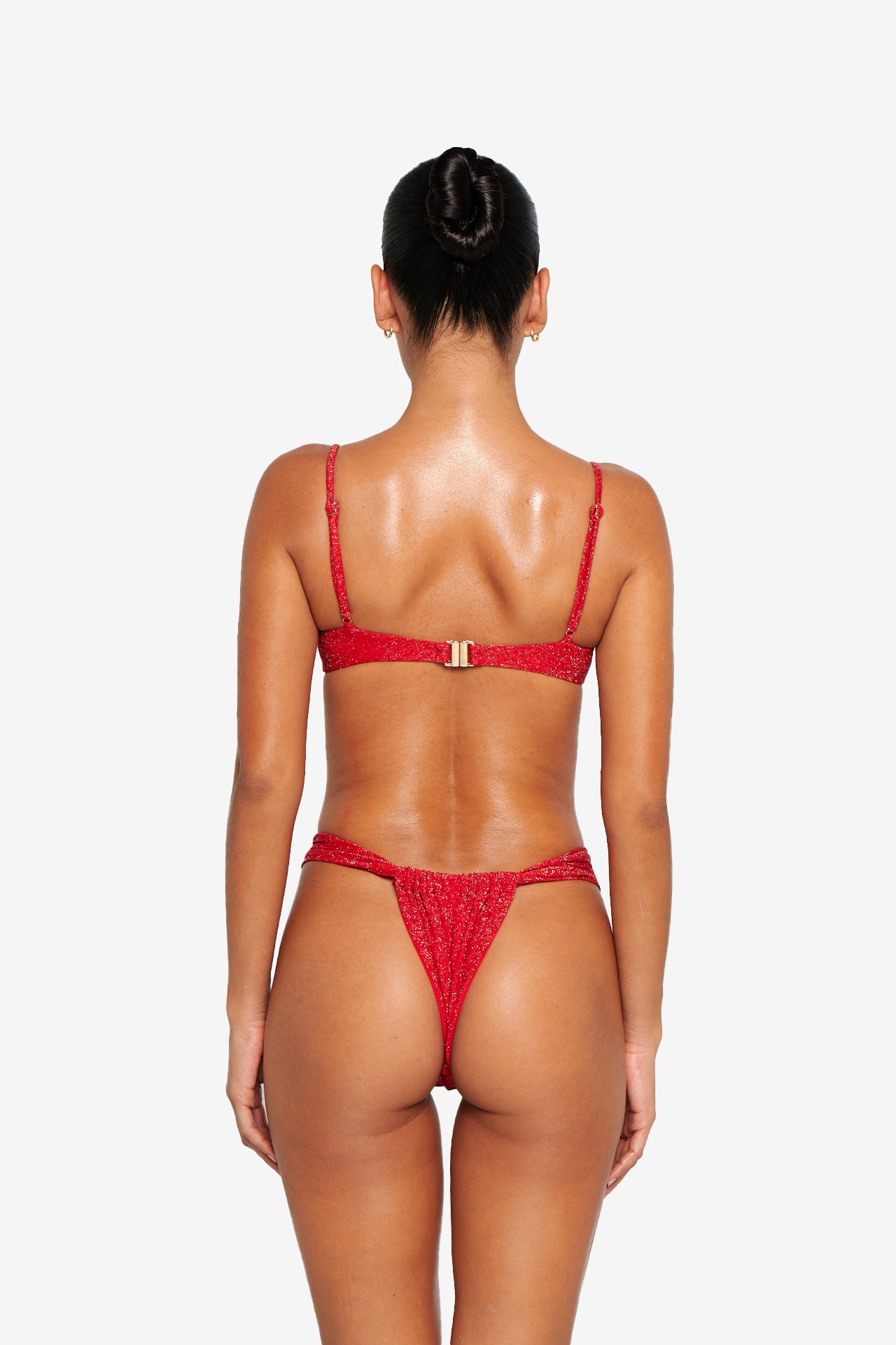 Supportive, sleek, and seriously sexy. The AZRA bikini top features sculpted underwire cups with minimal coverage, fine adjustable straps, and a clean back clasp for a modern finish. It lifts just enough, flatters effortlessly, and pairs perfectly with high- or low-rise bottoms.
