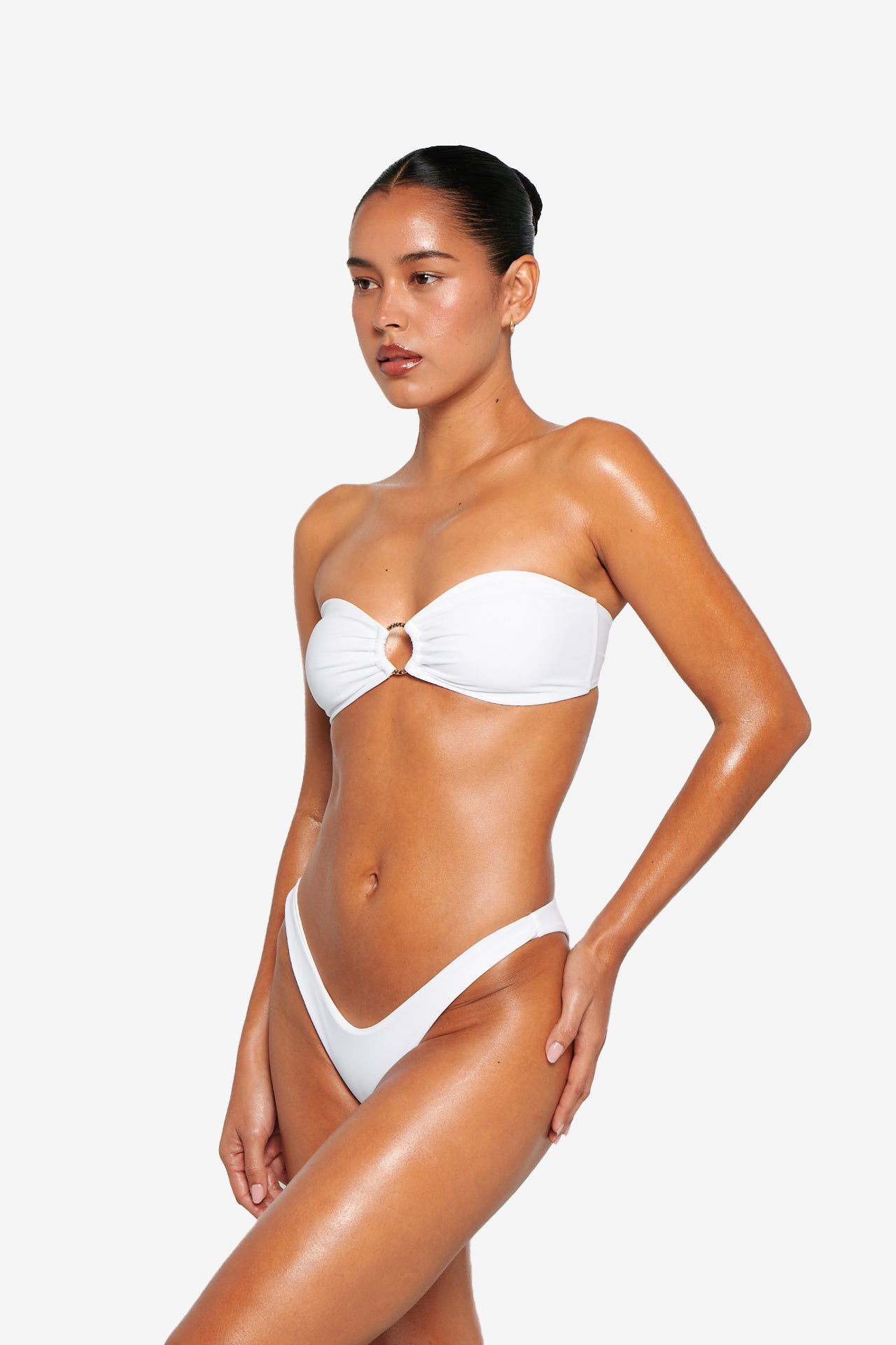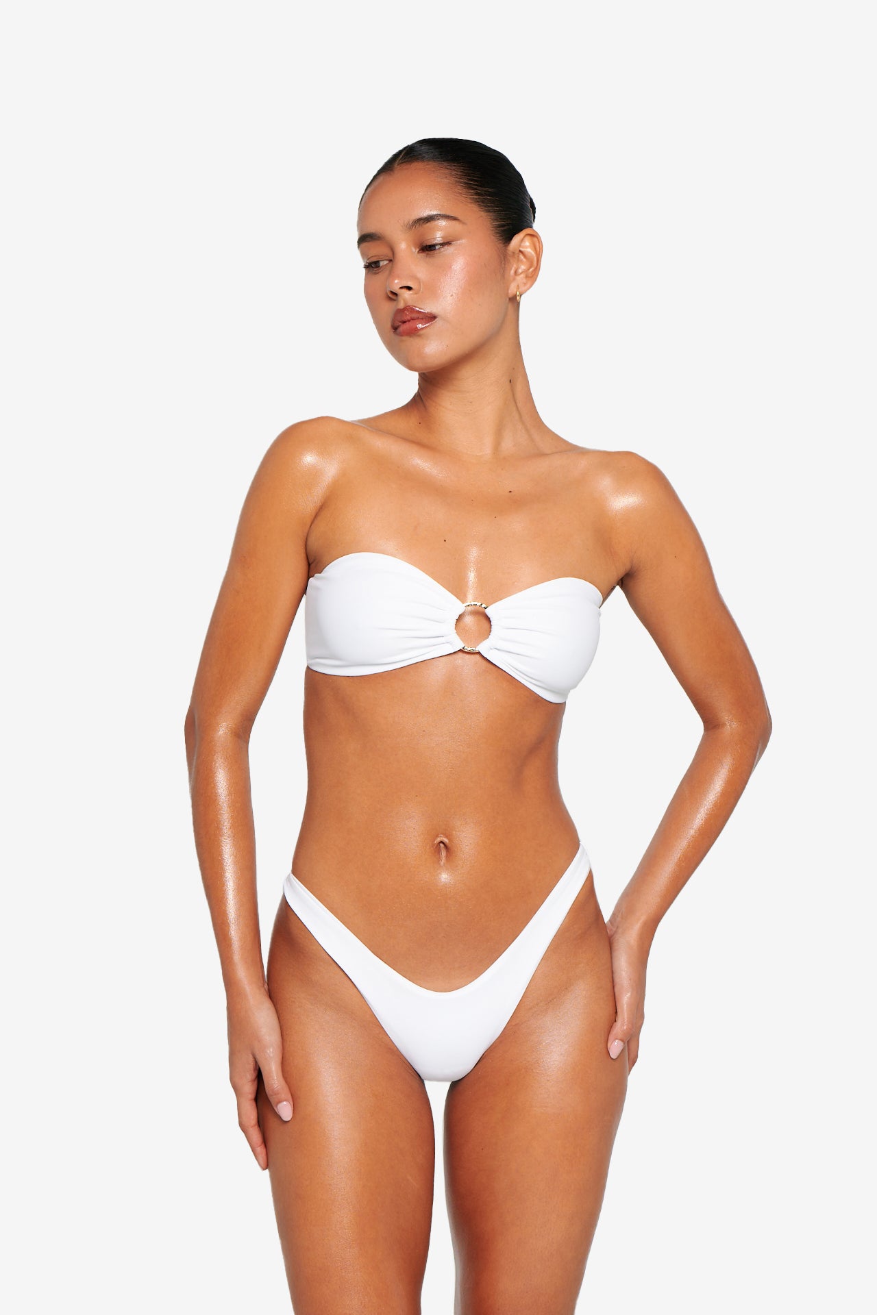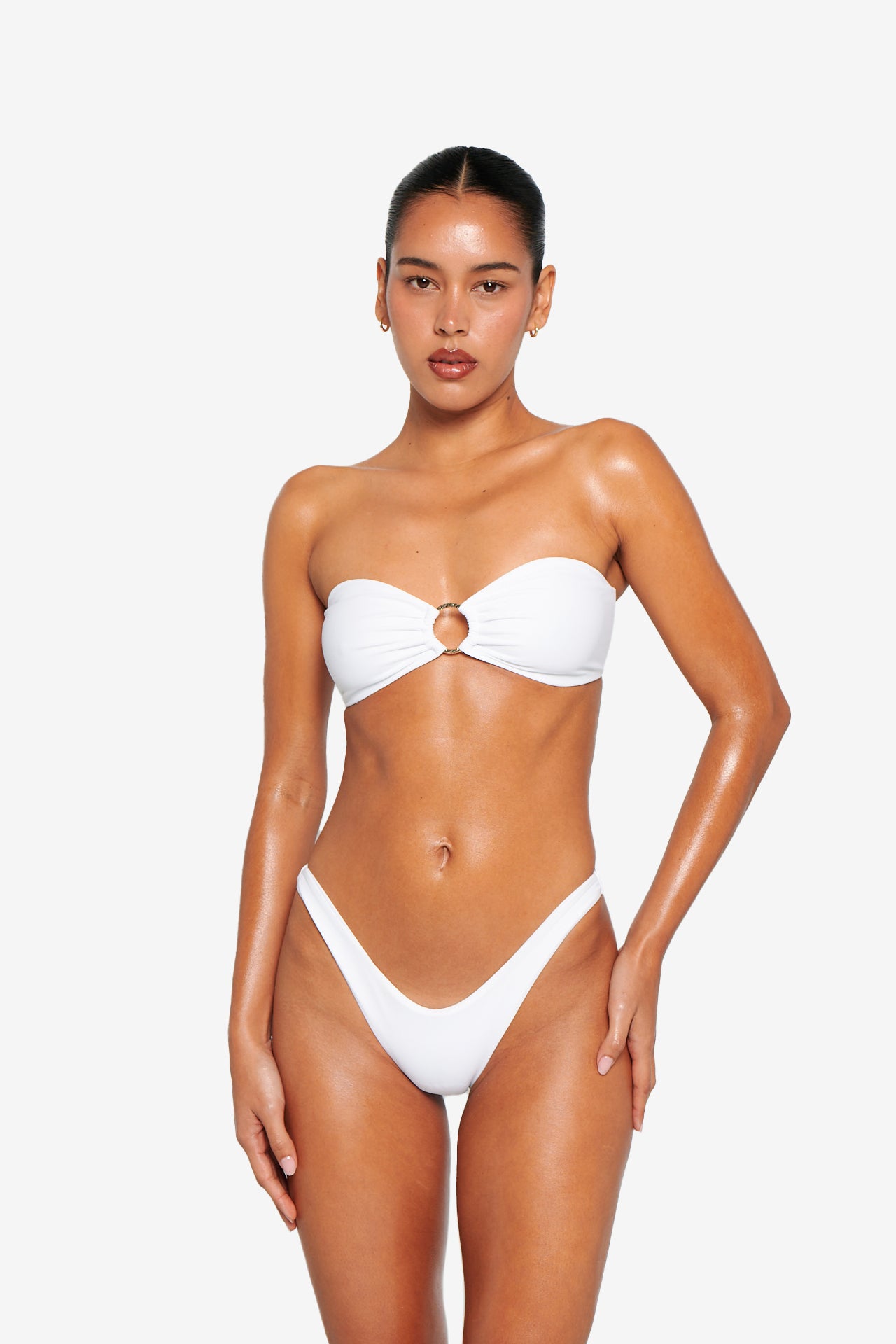 Chic, strapless, and made for golden skin. The ISLA bikini top is a classic bandeau silhouette with soft ruching and a gold centre bar detail to catch the light. Tie at the back for a custom fit. Style it with your go-to Adora Swim bottoms for a clean, elevated look.