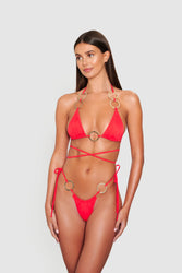 MAIORI bottom is a thong style with thin straps to elongate legs, finished with ADORA rings. Minimal coverage. Place straps over hips for a high rise cut or place on hips for a low-rise style.