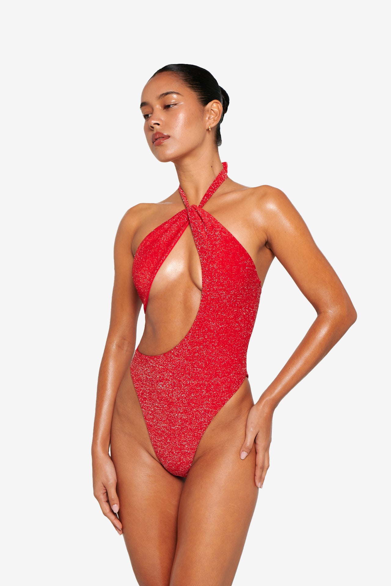 An architectural twist on the classic one-piece. The DELPHI swimsuit features a statement halter neckline with an elegant front twist that creates a bold asymmetric plunge. At the back, a curved open finish adds an ultra-elegant touch, while the high rise cut elongates legs and the cheeky bum keeps it playful.