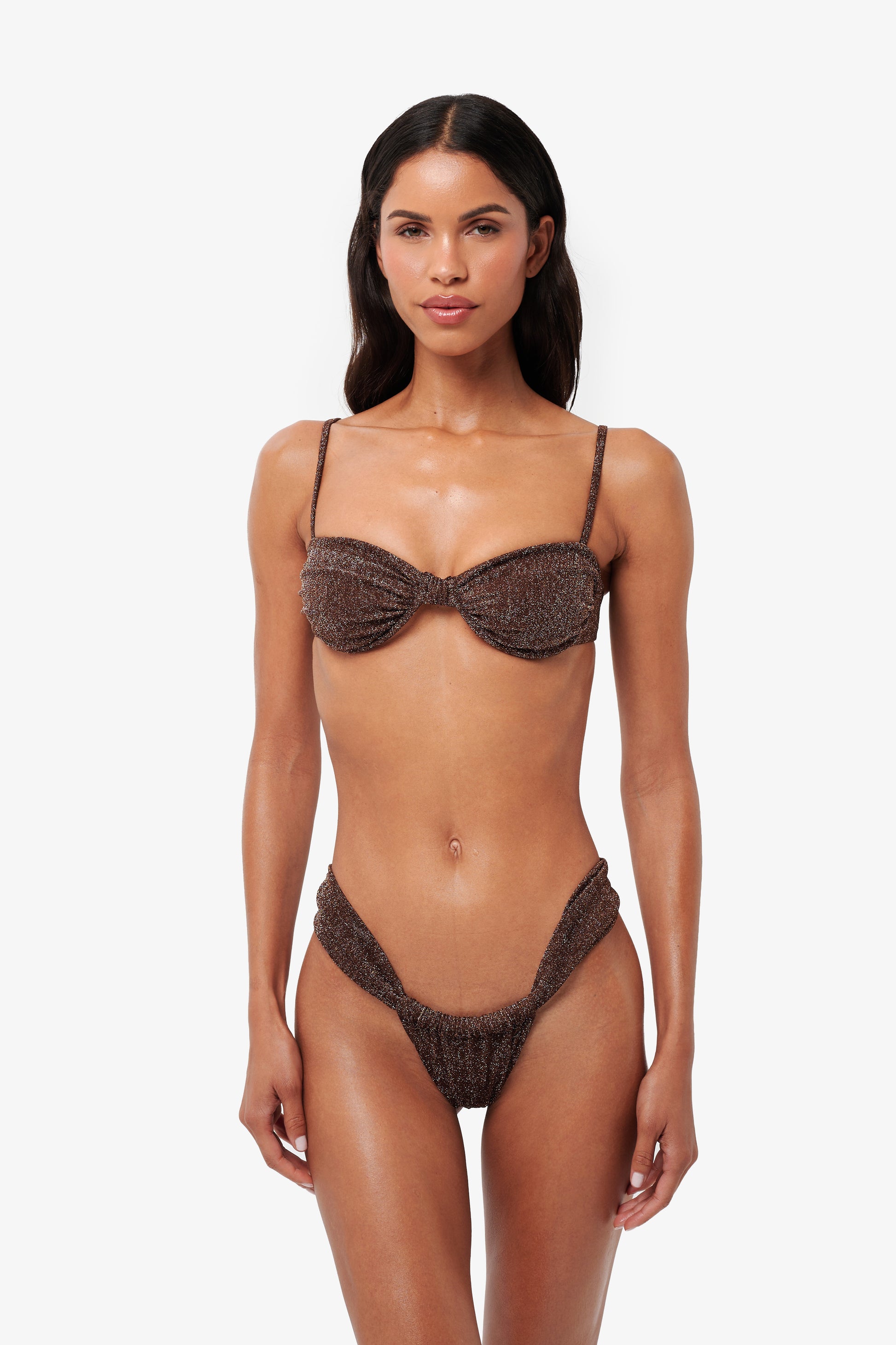 Supportive, sleek, and seriously sexy. The AZRA bikini top features sculpted underwire cups with minimal coverage, fine adjustable straps, and a clean back clasp for a modern finish. It lifts just enough, flatters effortlessly, and pairs perfectly with high- or low-rise bottoms.