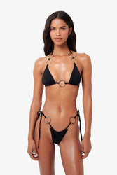 MAIORI bottom is a thong style with thin straps to elongate legs, finished with ADORA rings. Minimal coverage. Place straps over hips for a high rise cut or place on hips for a low-rise style.
