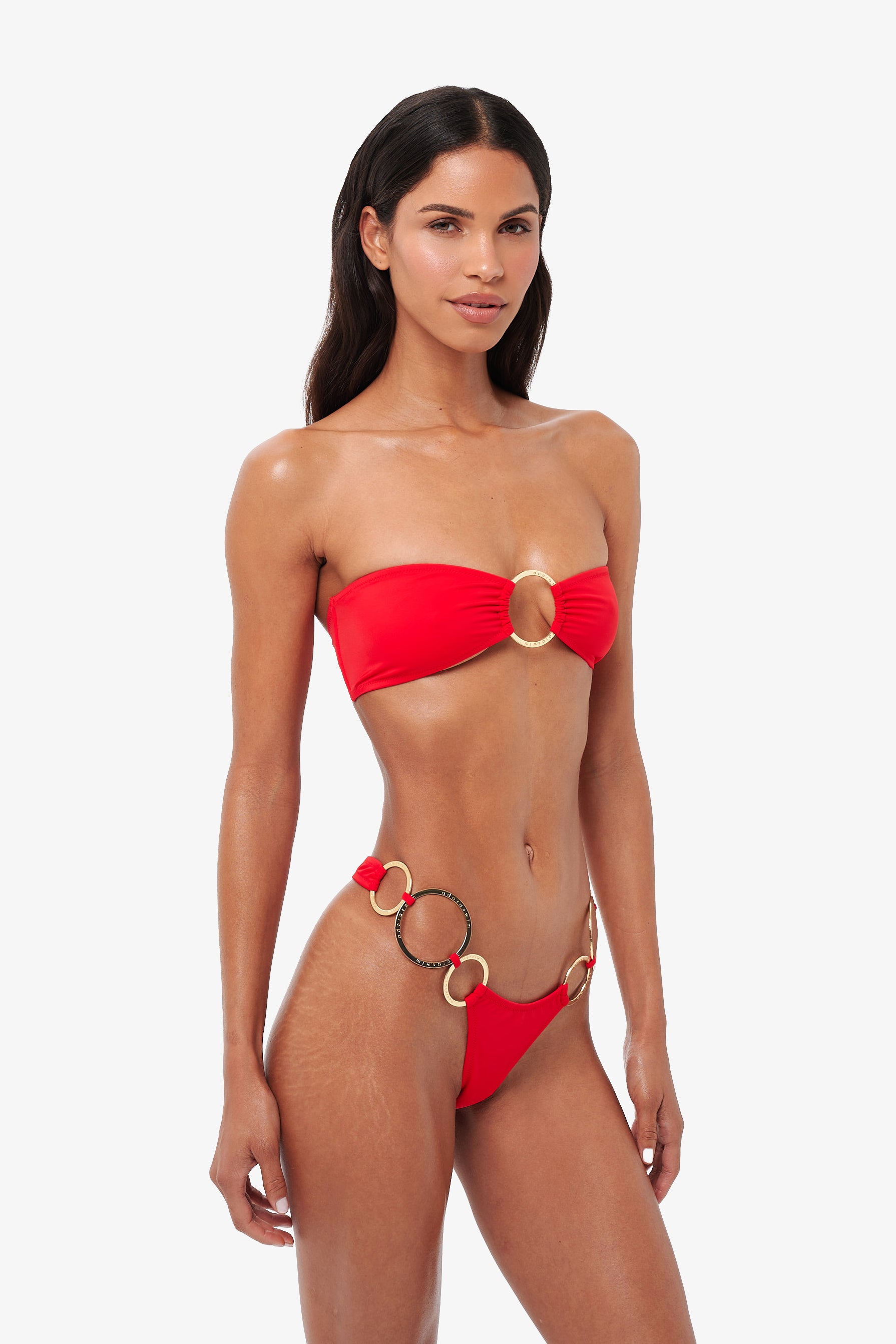Dare to dazzle in this multi ring bottom! Our favourite statement style features a thong style with 6 Adora Swim rings. Minimal coverage. Place straps over hips for high rise cut or place on hips for a low-rise style.
