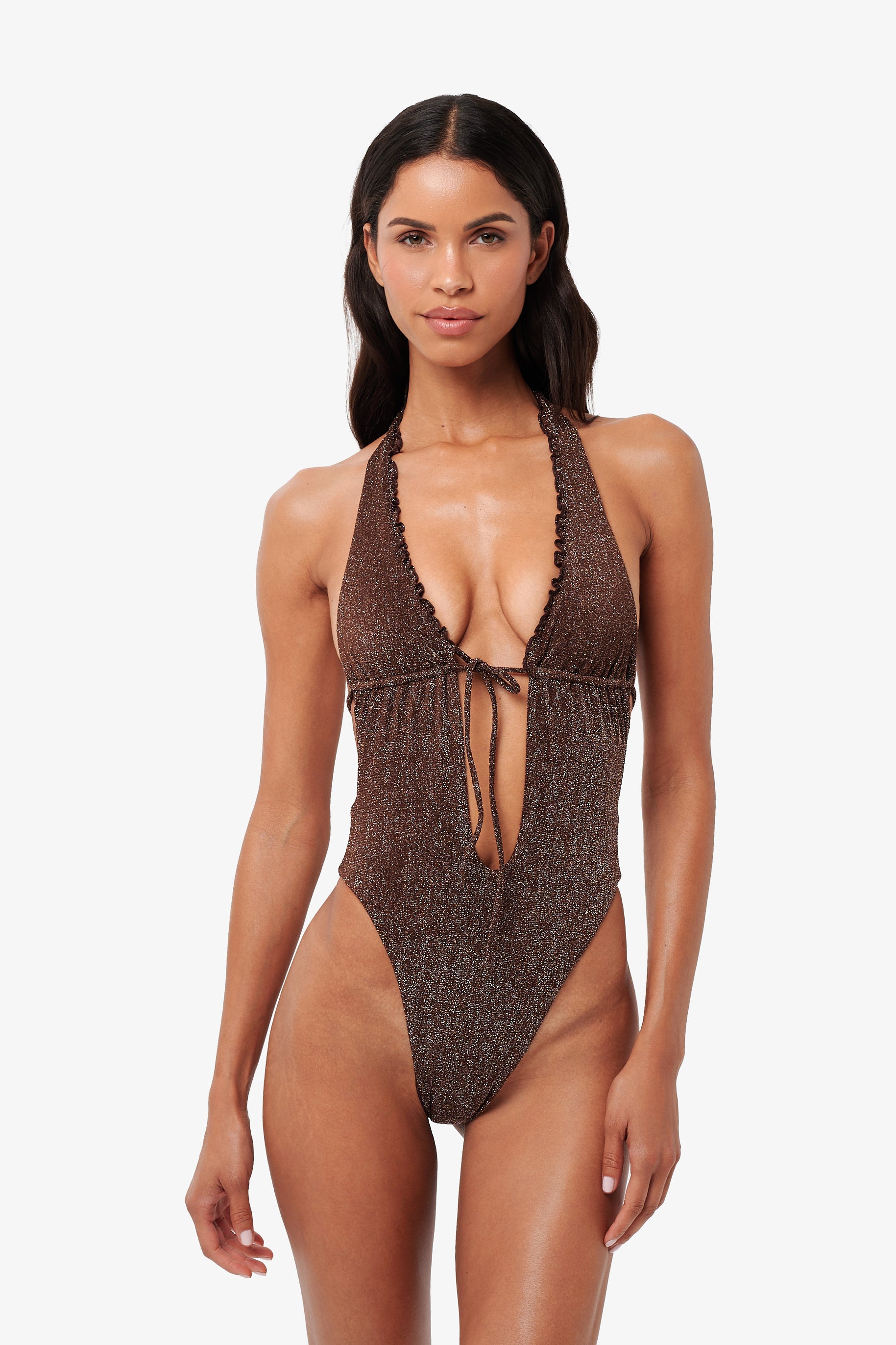 A poolside showstopper with a sultry edge. The SOLARA swimsuit was made to shine. Featuring a deep plunge neckline with soft ruffle detailing, an adjustable tie under the bust, and a flattering open back, this one-piece brings equal parts glamour and attitude. High rise cut to elongate legs, while the cheeky bum keeps it playful.